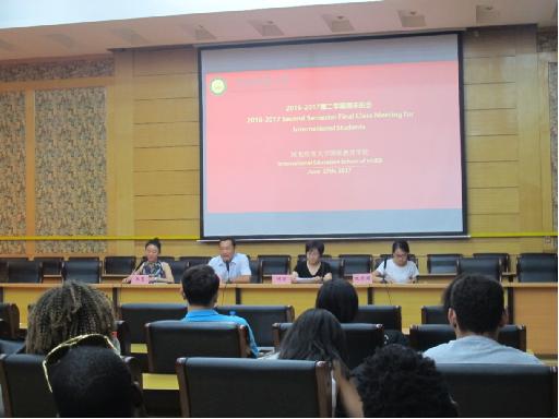 李钢书记首先发言,他总结了本学期员工管理工作,并对优秀职工进行了表彰;何懿副经理对员工给予美好的期许,希望毕业生回国发展顺利,前程似锦,在校生努力学习,在中国度过愉快的时光;班主任强调了暑假放假、开学的时间及暑期请销假制度、防火防汛防诈骗、人身防护等安全问题,希望员工合理安排暑期生活;最后职工公寓宿管老师和员工代表即兴发言,师生依依不舍,共话友情,班会充满温馨、气氛热烈。