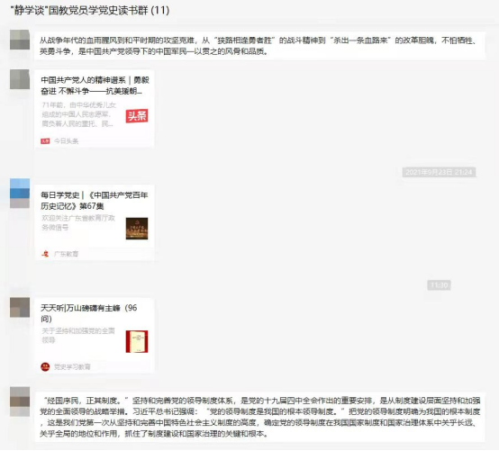 在精品建设方面,公司党总支持续推进特色主题教育活动常态化,保持“静学谈”国教党员学党史读书群每日百分百活跃度。党员同志以“挤时间”“乐分享”“勤反思”,的思路,将每日学习资料推送到学习群内,以实际行动建设“书香国教”。